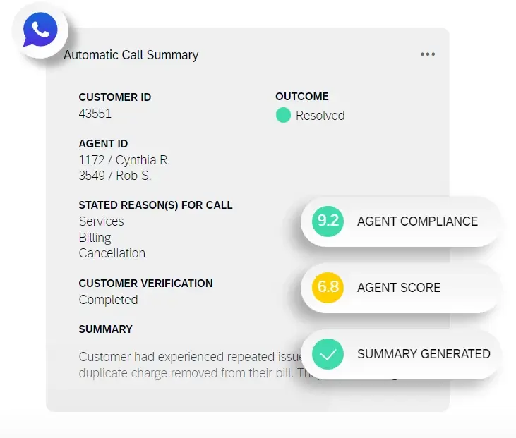 A call center CRM by itself won’t necessarily monitor script compliance, empathy and other key factors that can affect customer experience. With more encompassing software, you can evaluate every single interaction with constant call monitoring, providing a more accurate view of each agent’s performance than sampling calls. Not only that, but you can automatically deliver insights after each call to the agent to help train them to be more efficient and effective.